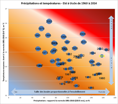 Le tableau ci-dessous est un bilan climatologique de l'eté 2014 (de juin 2014 à août 2014) pour 4 paramètres. Cette saison peut être comparée aux étés les plus extrêmes pour chacun des paramètres.