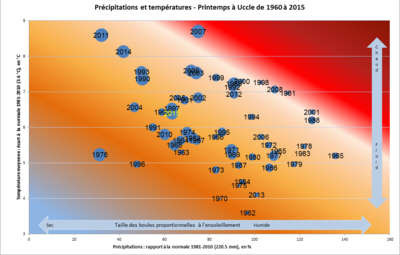 Le tableau ci-dessous est un bilan climatologique du printemps 2015 (de mars 2015 à mai 2015) pour 4 paramètres. Cette saison peut être comparée aux printemps les plus extrêmes pour chacun des paramètres.
