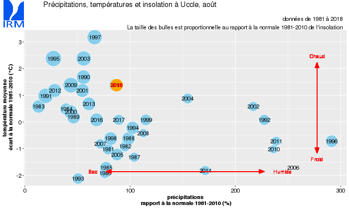 Le tableau ci dessous donne les valeurs mensuelles d'une série de paramètres relevés à Uccle (colonne 'Mois'), ainsi que leurs valeurs mensuelles normales ( 'Norm.') et les valeurs mensuelles records observées de 1981 à 2017 ('Record +' et 'Record -', avec les années). La colonne 'car' donne une caractéristique statistique de la valeur mensuelle observée ('Mois').
