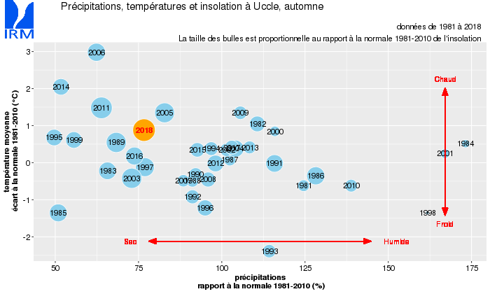 Le tableau ci-dessous est un bilan climatologique de l'automne 2018 (de septembre 2018 à novembre 2018) pour 4 paramètres. Cette saison peut être comparée aux automnes les plus extrêmes pour chacun des paramètres.