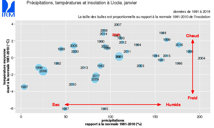 Le jour de l'an, notre pays subit de forts coups de vent causés par une puissante dépression située entre l'Ecosse et la Norvège et dirigeant sur nos régions de l'air maritime doux et humide. Du 2 au 5, le pays resta sous l'influence de vents forts liés à une nouvelle zone de basse pression se déplaçant de l'Océan Atlantique vers l'Europe occidentale. La masse d'air associée resta douce et humide. A partir du 6, la présence d'un anticyclone au-dessus de l'Ecosse dirigea sur nos régions de l’air continental plus sec et plus frais. A partir du 8, cet anticyclone se déplaça vers le nord-est de l'Europe. Au début, la masse d'air arrivant sur notre pays resta encore fraîche, mais à partir du 10, la présence d’une dépression située au sud de l’Islande dirigea à nouveau sur nos contrées de l’air maritime plus doux et plus humide. Du 11 au 14, une puissante zone de haute pression centrée sur le sud de la Finlande et les pays baltes amena sur notre pays de l’air continental frais et sec. A partir du 15, notre temps subit l’influence du passage sur l’Europe occidentale de plusieurs dépressions originaires du sud du Groenland. Nos régions furent alors soumises durant plusieurs jours à un régime de vents soutenus, dans de l’air maritime relativement doux et humide, avec comme point d’orgue le passage d’une puissante tempête au développement rapide le 18, qui provoqua de fortes rafales de vent et des dégâts dans notre pays. Le 19, le vent faiblit et le temps redevint plus sec. Le 20, une nouvelle dépression traversa notre pays d’ouest en est. Le 21, nos régions étaient situées entre un complexe de basse pression situé au sud de l’Islande et un anticyclone centré au-dessus du sud du Portugal et de l’air maritime frais et humide circula sur le pays. A partir du 22, le cœur de la zone de basse pression se déplaça vers l’Ecosse et les masses d’air s’orientèrent davantage au sud-ouest, dirigeant sur notre pays jusqu’au 25 de l’air plus doux, mais constamment humide. A partir du 26, l’anticyclone s’étendit au-dessus du sud de l’Europe. Sur son flanc nord, des masses d’air humides et relativement douces, dans lesquelles de nombreux fronts circulaient, déterminèrent notre temps jusqu’à la fin du mois. La pression atmosphérique moyenne, ramenée au niveau de la mer, fut de 1012,1 hPa à Uccle (norm.: 1017,5 hPa).