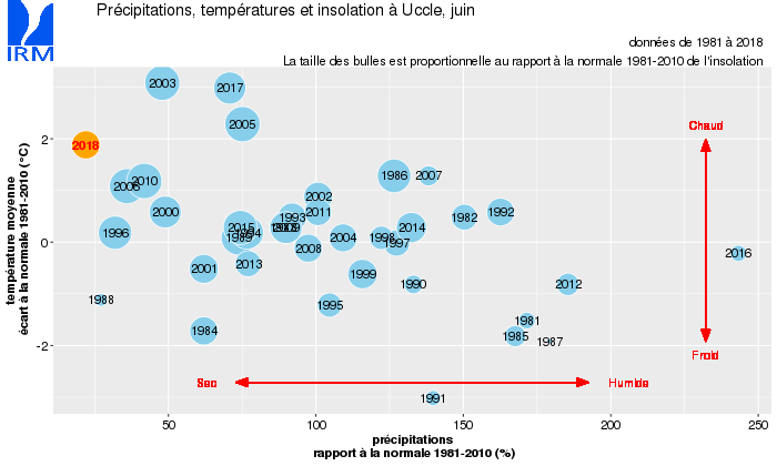 Le tableau ci dessous donne les valeurs mensuelles d'une série de paramètres relevés à Uccle (colonne 'Mois'), ainsi que leurs valeurs mensuelles normales ( 'Norm.') et les valeurs mensuelles records observées de 1981 à 2017 ('Record +' et 'Record -', avec les années). La colonne 'car' donne une caractéristique statistique de la valeur mensuelle observée ('Mois').