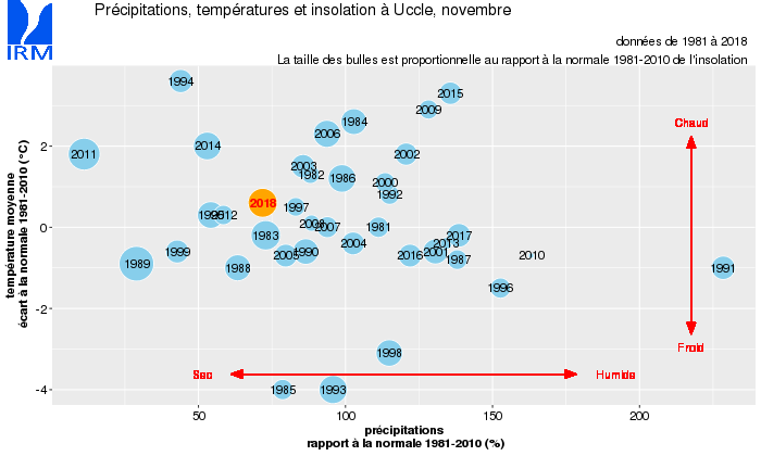 Le tableau ci dessous donne les valeurs mensuelles d'une série de paramètres relevés à Uccle (colonne 'Mois'), ainsi que leurs valeurs mensuelles normales ( 'Norm.') et les valeurs mensuelles records observées de 1981 à 2017 ('Record +' et 'Record -', avec les années). La colonne 'car' donne une caractéristique statistique de la valeur mensuelle observée ('Mois').
