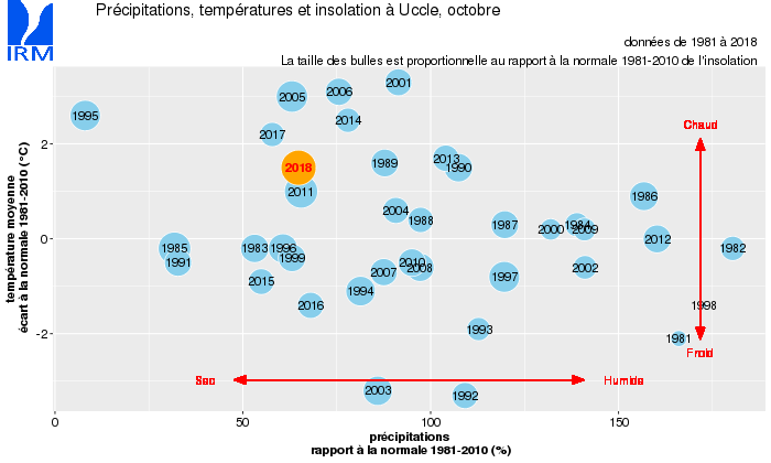 Le tableau ci dessous donne les valeurs mensuelles d'une série de paramètres relevés à Uccle (colonne 'Mois'), ainsi que leurs valeurs mensuelles normales ( 'Norm.') et les valeurs mensuelles records observées de 1981 à 2017 ('Record +' et 'Record -', avec les années). La colonne 'car' donne une caractéristique statistique de la valeur mensuelle observée ('Mois').