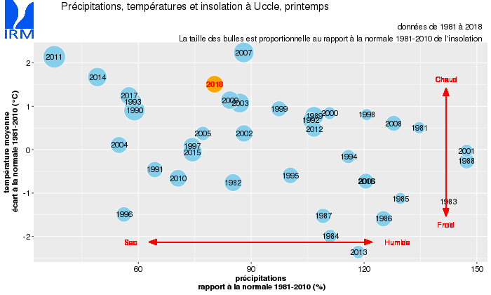Le tableau ci-dessous est un bilan climatologique de l'printemps 2018 (de mars 2018 à mai 2018) pour 4 paramètres. Cette saison peut être comparée aux printemps les plus extrêmes pour chacun des paramètres.