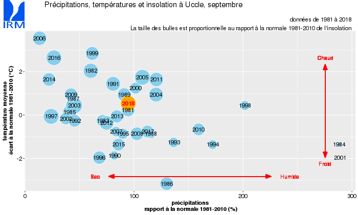 Le tableau ci dessous donne les valeurs mensuelles d'une série de paramètres relevés à Uccle (colonne 'Mois'), ainsi que leurs valeurs mensuelles normales ( 'Norm.') et les valeurs mensuelles records observées de 1981 à 2017 ('Record +' et 'Record -', avec les années). La colonne 'car' donne une caractéristique statistique de la valeur mensuelle observée ('Mois').