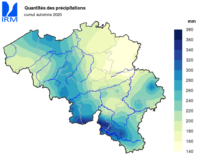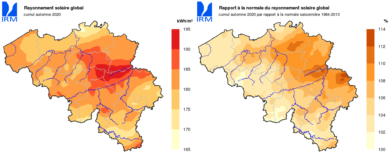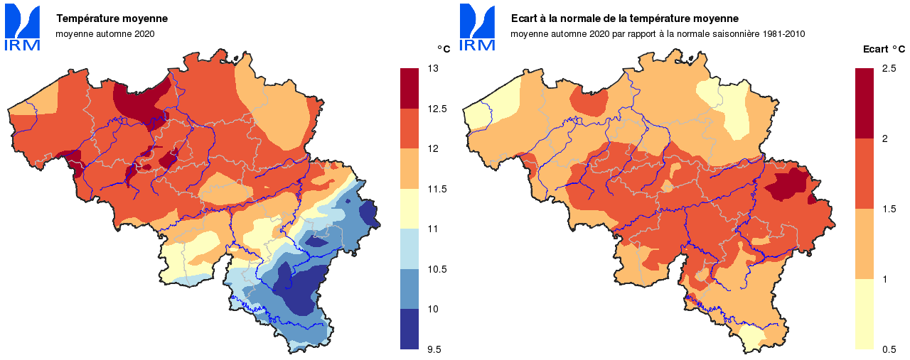 Cette fréquence de températures relativement élevées a induit un automne globalement chaud, avec une température moyenne de 12,3°C (normale : 10,9°C). L’automne 2020 se place à la quatrième place des automnes les plus chauds depuis le début des relevés à Bruxelles-Uccle (1833), mais est resté bien en dessous du record de 2006 (13,9°C).