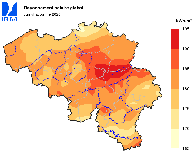 Globalement, l’automne fut un peu plus ensoleillé qu’en moyenne. Au total, à Uccle, le soleil a brillé pendant 346h 35min (normale : 322h 00min).