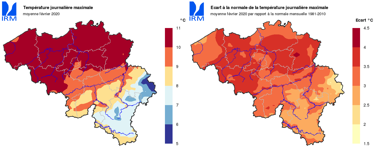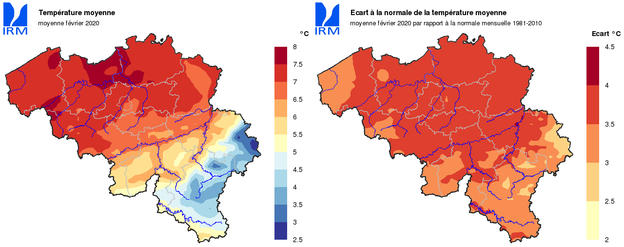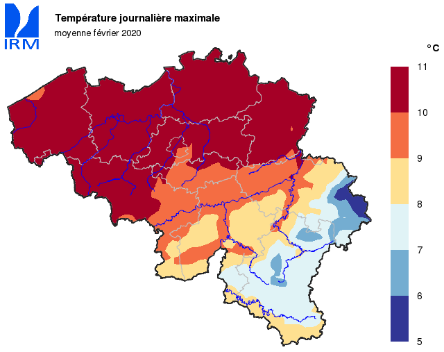 La température moyenne mensuelle a atteint à Uccle une valeur de 7,0°C (normale : 3,7°C). Depuis 1833, seuls les mois de février 1990 (7,9°C), 1926 (7,6°C), 1961 (7,2°C) et 2002 (7,2°C) ont été encore plus chauds.