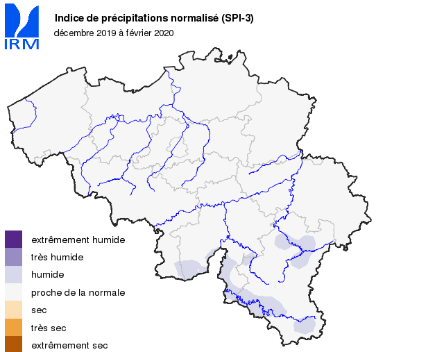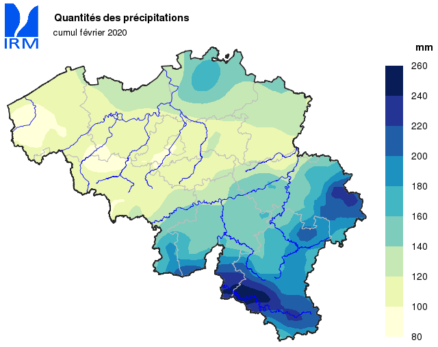 Les quantités régionales moyennes de précipitations ont toutes été largement supérieures aux valeurs normales. Elles ont varié d’environ 175% de la normale dans le Tournaisis et les Brabants à environ 220% en Campine et dans l’Entre-Sambre-et-Meuse.