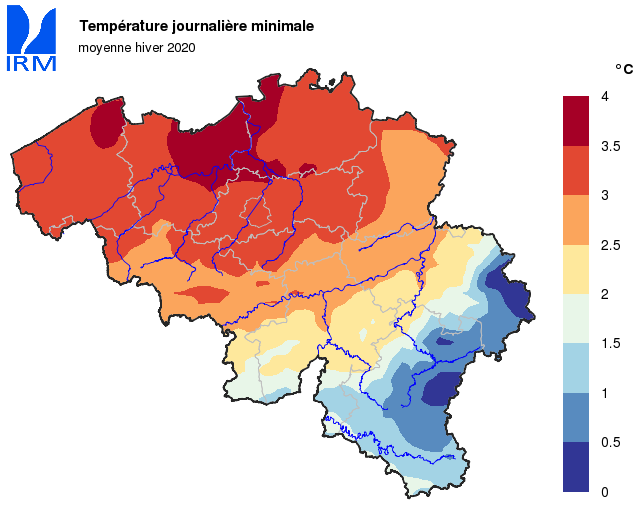 Au cours de la saison, les températures ont varié à Uccle entre –2,5°C et 16,6°C. On y a enregistré à peine 14 jours de gel [min<0°C] (normale : 32,1 jours) au cours de l’hiver et, pour la 6e fois depuis 1981, pas un seul jour d’hiver [max<0°C] (normale : 6,5 jours).