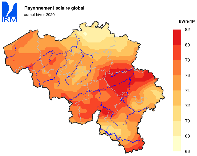 Décembre fut un peu plus ensoleillé qu’en moyenne, mais janvier et février furent déficitaires, conduisant à une durée d’insolation pour la saison légèrement en dessous de la valeur normale. On a relevé cet hiver 169h 58min d’ensoleillement à Uccle, pour une normale de 180h 29min.