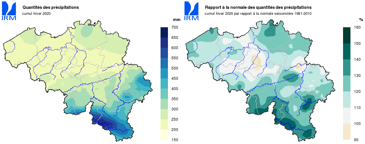 Les moyennes régionales des quantités de précipitations hivernales sont partout supérieures aux valeurs normales dans le pays. Elles ont varié entre environ 110% de la normale dans les Brabants à environ 135% de la normale en Lorraine belge.