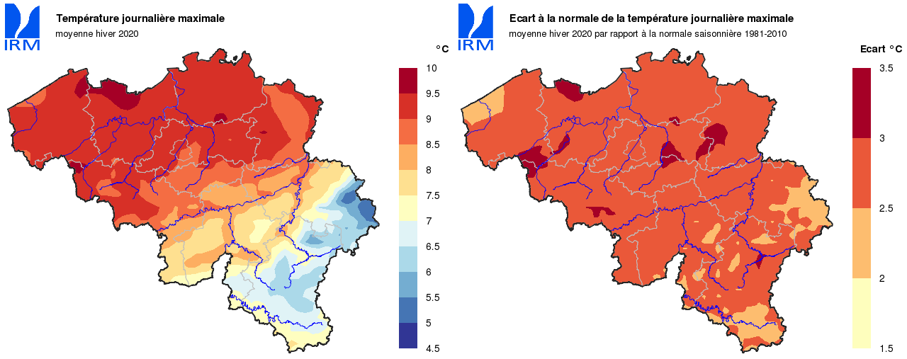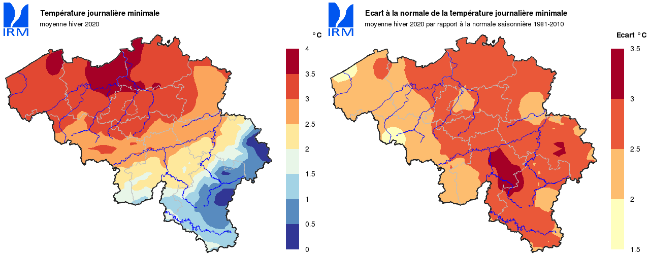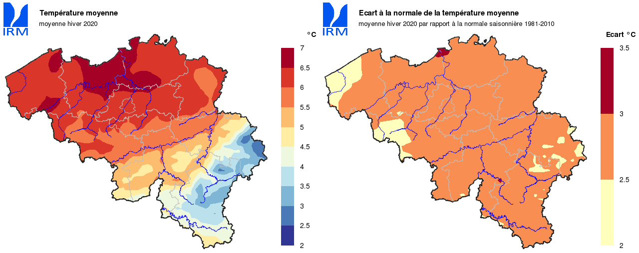 L’hiver 2020 restera comme l’un des hivers les plus doux que nous ayons connus depuis presque 200 ans. Depuis 1833, le record de température hivernal à Uccle reste celui observé en 2007 (6,6°C). Les trois hivers suivants, dont l’hiver 2020, se tiennent dans un mouchoir de poche et il faut aller jusqu’aux centièmes de degrés pour les départager : l’hiver actuel se situe alors en 3e position, juste derrière 2016 et juste devant 2014. L’hiver 1990 (6,0°C) complète le top 5.