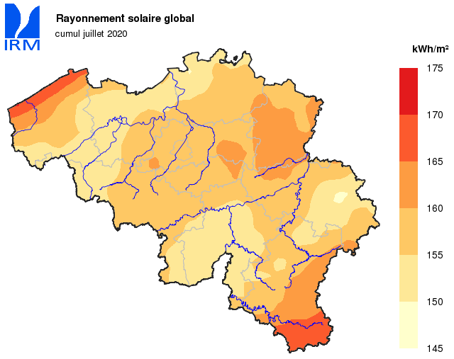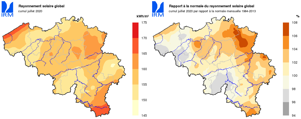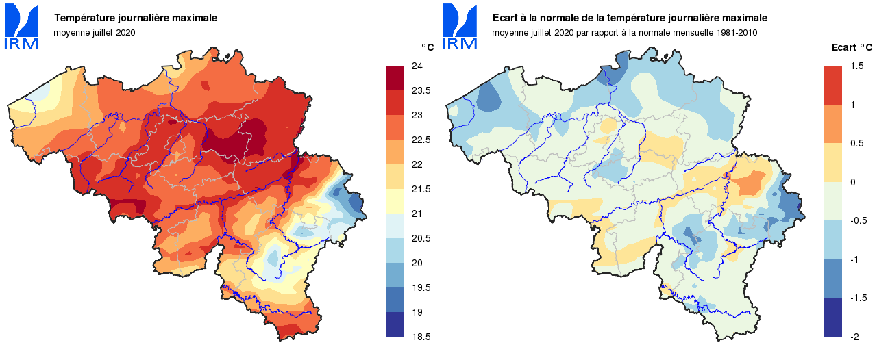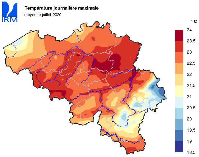 A Uccle, durant une grande partie du mois, les températures journalières sont restées inférieures à leurs valeurs normales. Il a fallu attendre le 23 juillet pour y observer le premier jour d’été [max>=25°C] : on a relevé une température maximale de 25,5°C ce jour-là. Le seul jour de chaleur [max>=30°C] n’a été enregistré que lors de la dernière journée du mois : le 31, on a mesuré une température maximale journalière de 36,5°C. C’est la 3e journée la plus chaude jamais observée à Uccle, loin derrière le record absolu du 25 juillet 2019 (39,7°C), mais proche de la température relevée le 27 juin 1947 (36,8°C).