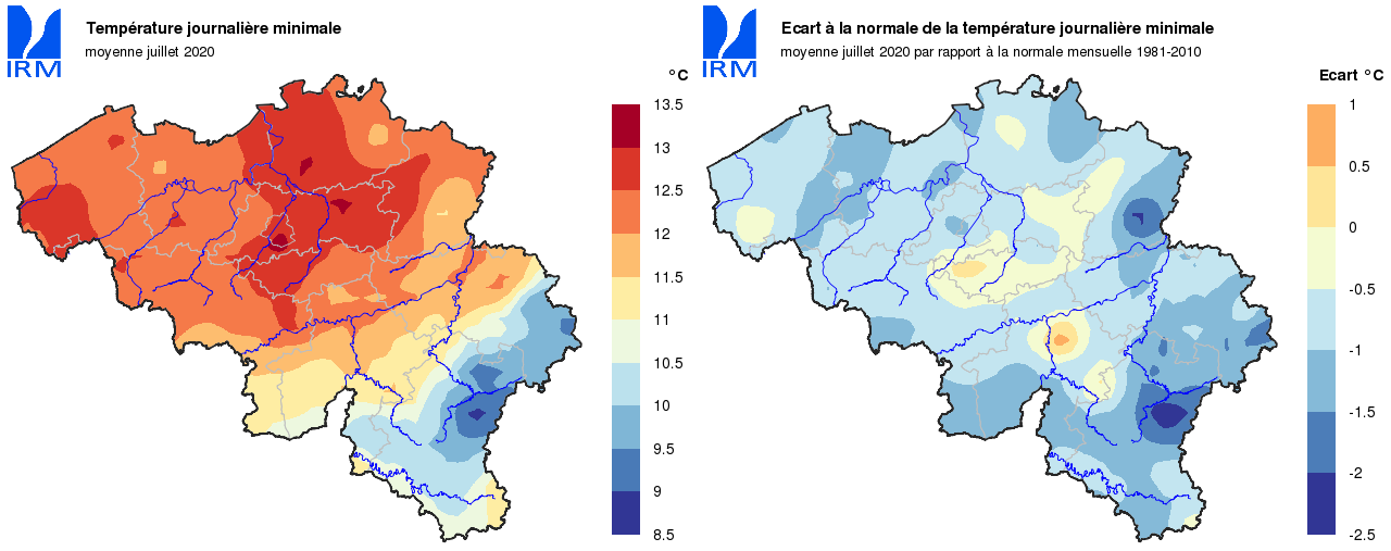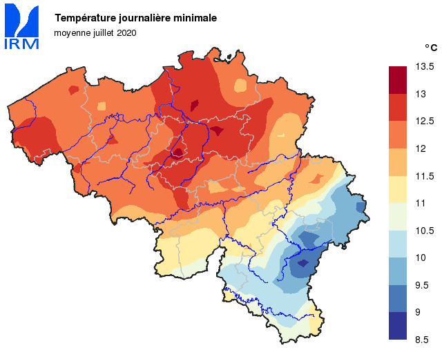 Dans le reste du pays, la température la plus élevée a été mesurée le 31. A Hérinnes (Pecq), la température est alors montée jusqu’à 38,2°C. La température la plus basse a été mesurée le 7 à Elsenborn (Bütgenbach), avec un minimum de 2,7°C.