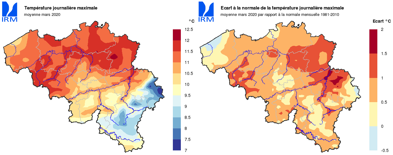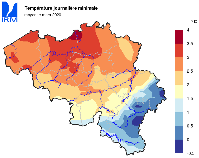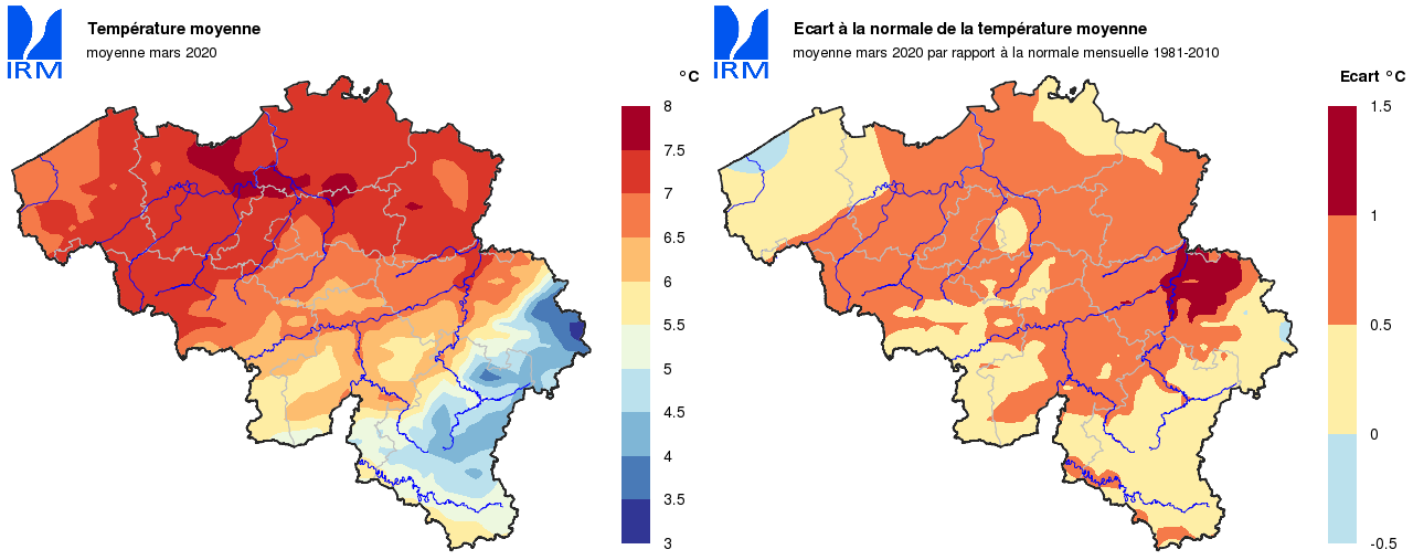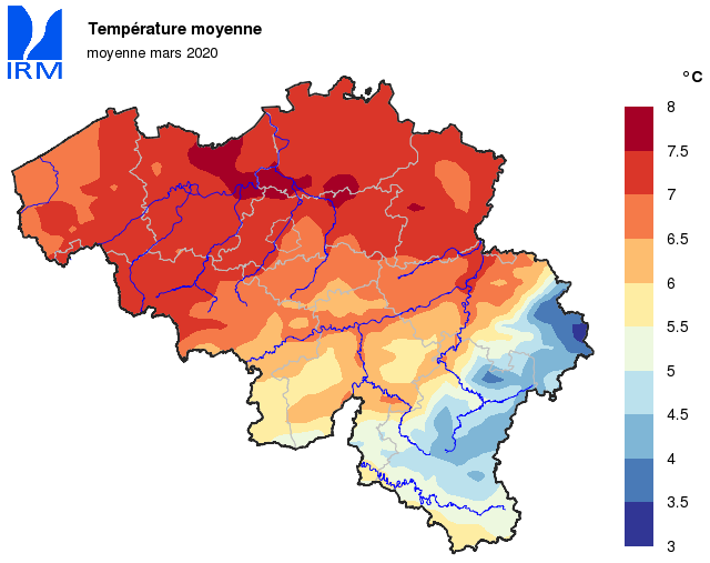 La température moyenne mensuelle à Uccle fut de 7,1°C (normale : 6,8°C). On remarquera que cette valeur mensuelle est égale à celle mesurée en février.