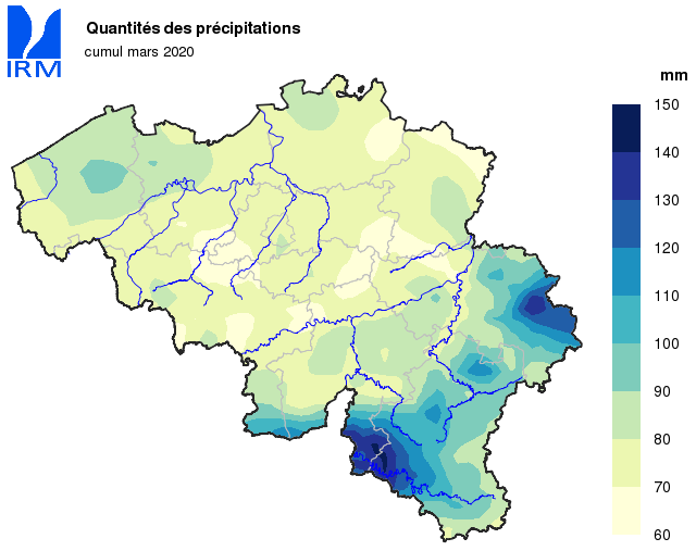 Dans le pays, les quantités régionales moyennes de précipitations ont presque partout été supérieures aux valeurs normales. Elles ont varié entre environ 90% de la normale en Lorraine belge et environ 150% de la normale au littoral.