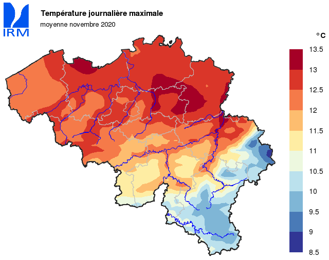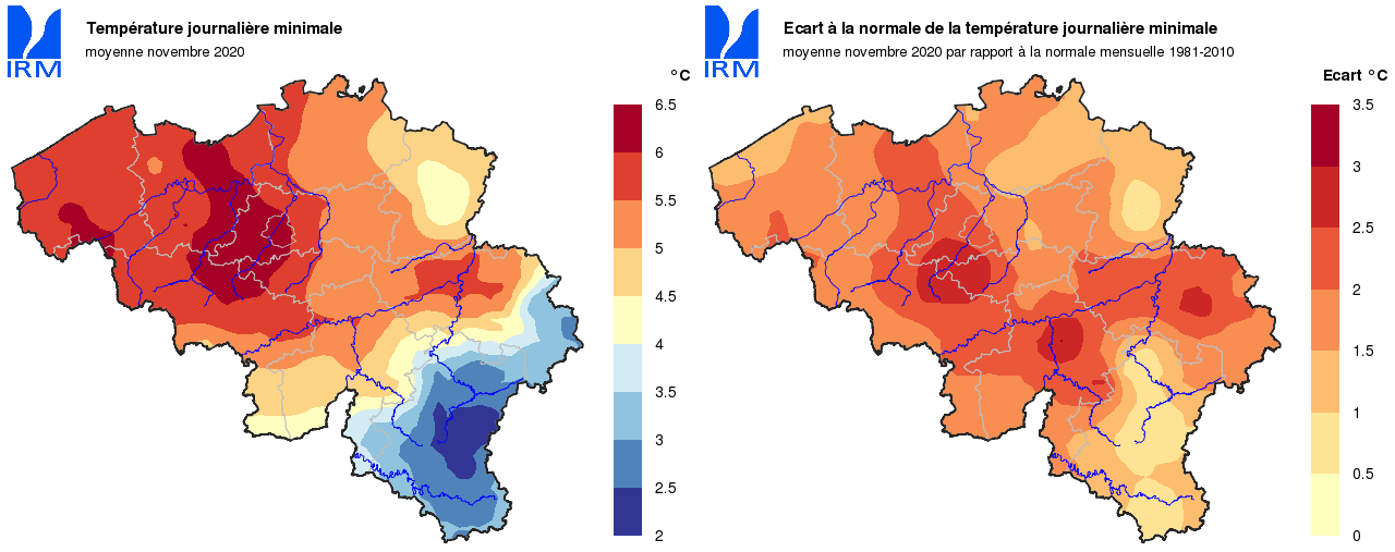 En ce qui concerne la température moyenne, novembre 2020 fut aussi un mois très chaud, puisque cette température atteignit en moyenne une valeur de 9,2°C (normale : 6,8°C). C’est, avec 1852, le cinquième mois de novembre le plus chaud depuis 1833.