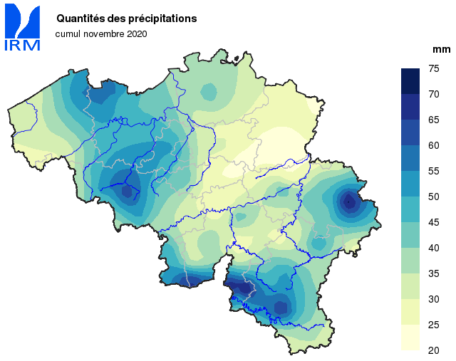 Les quantités régionales moyennes de précipitations dans le pays ont partout été largement inférieures aux normales sur l’ensemble du mois. Elles furent comprises entre environ 35% de la normale en Lorraine belge et environ 60% de la normale dans le Tournaisis.