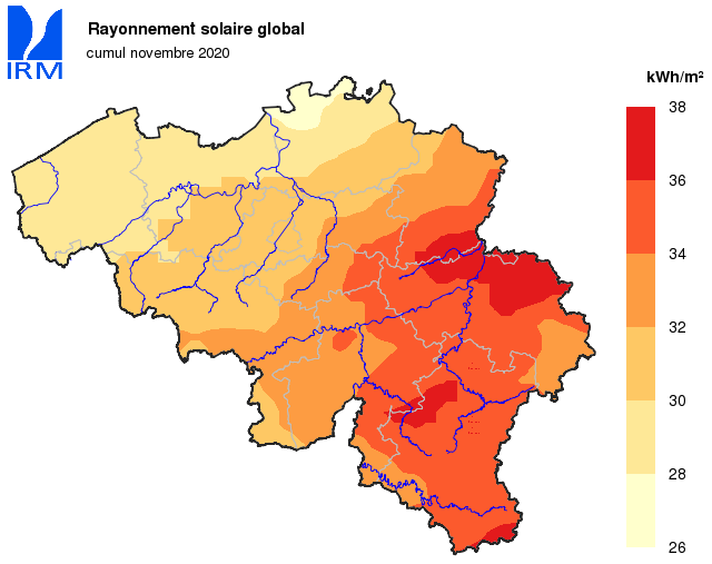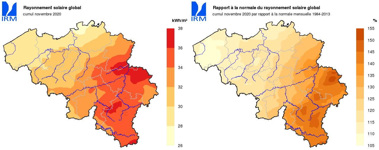 A Uccle, la durée d’insolation mensuelle a atteint un total de 92h 59min (normale : 66h 17min), soit bien plus qu’au cours du mois précédent, en octobre (56h 32min, normale : 112h 38min). Cette valeur positionne novembre 2020 à la cinquième position des mois de novembre les plus ensoleillés depuis 1981. Le record date de 1989, avec 135h 33min de soleil.