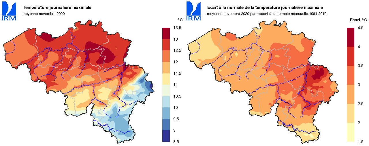 Jusqu'au 26 inclus, un nouveau record absolu de température maximale moyenne se profilait (mesures depuis 1901). A cette date, la moyenne de cette température atteignait 13,2°C (record : 13,1°C en 2015). En raison des températures plus basses des derniers jours, la valeur de cette température a finalement chuté à 12,5°C, classant tout de même novembre 2020 en quatrième place dans la liste des mois de novembre les plus chauds depuis 1901 pour les températures maximales.