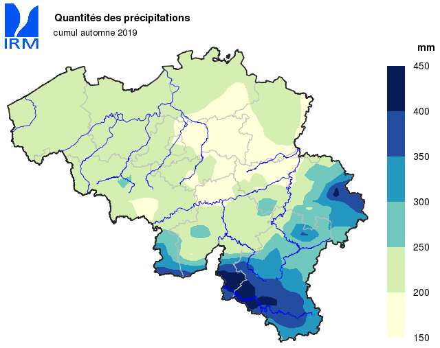Dans le pays, les quantités régionales moyennes de précipitations saisonnières ont été proches des normales et ont varié d’environ 90% à la côte et dans les Polders à environ 120% en Lorraine belge.