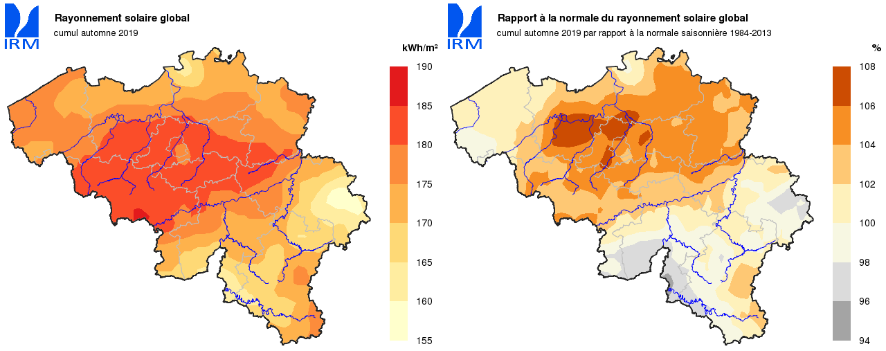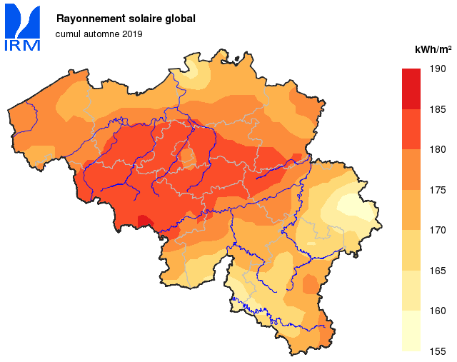 Du 24 septembre au 21 octobre inclus, nous n’avons que rarement vu le soleil : il n’a brillé à Uccle que 46h 17min (normale : 107h 12min). Par contre, durant le reste de la saison, le soleil a parfois été très généreux. Au final, l’automne aura été tout à fait normal en ce qui concerne la durée d’insolation : le soleil a brillé 322h 23min à Uccle (normale : 322h 00min).