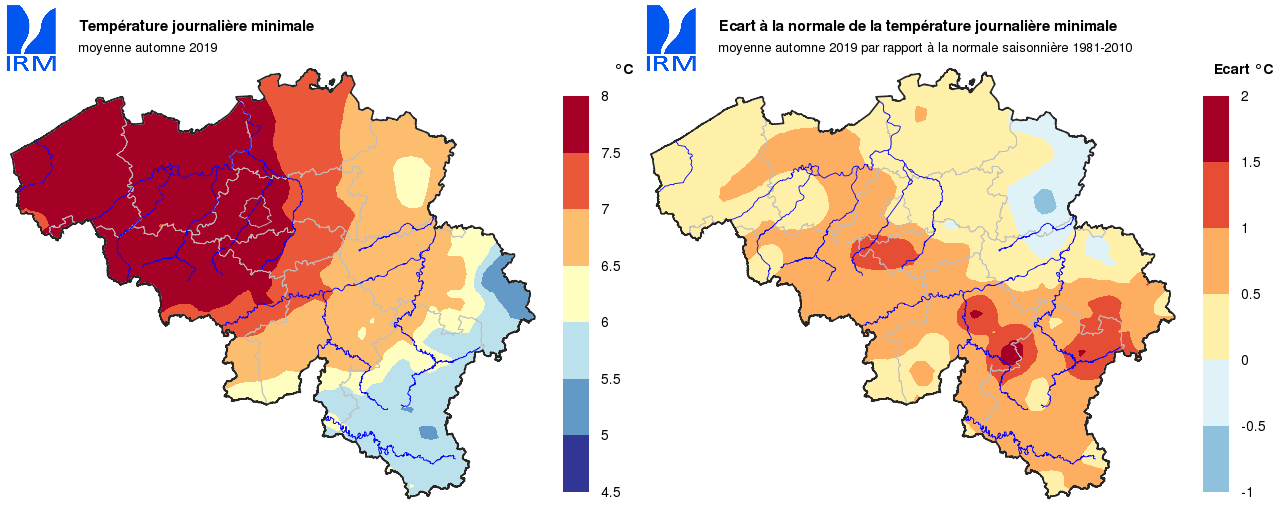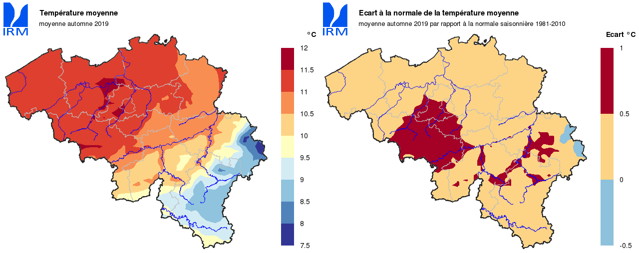 A Uccle, septembre et octobre furent un peu plus chauds que la normale, tandis que novembre, quant à lui, a été un peu plus frais. Ceci résulte en un automne légèrement plus chaud qu’en moyenne (11,3°C, pour une normale de 10,9°C).