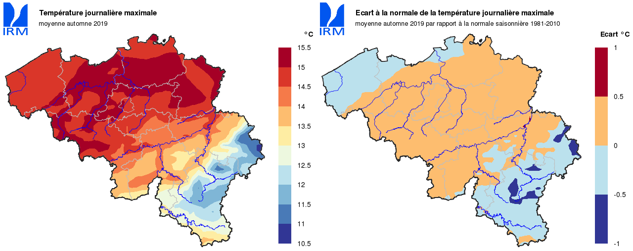 Dans le pays, la température automnale la plus élevée fut mesurée le 21 septembre (28,4°C à Koersel [Beringen] et Kleine-Brogel [Peer]) et la température la plus basse fut mesurée le 20 novembre (–6,5°C à Elsenborn [Bütgenbach]).