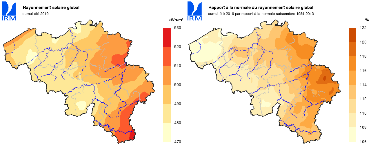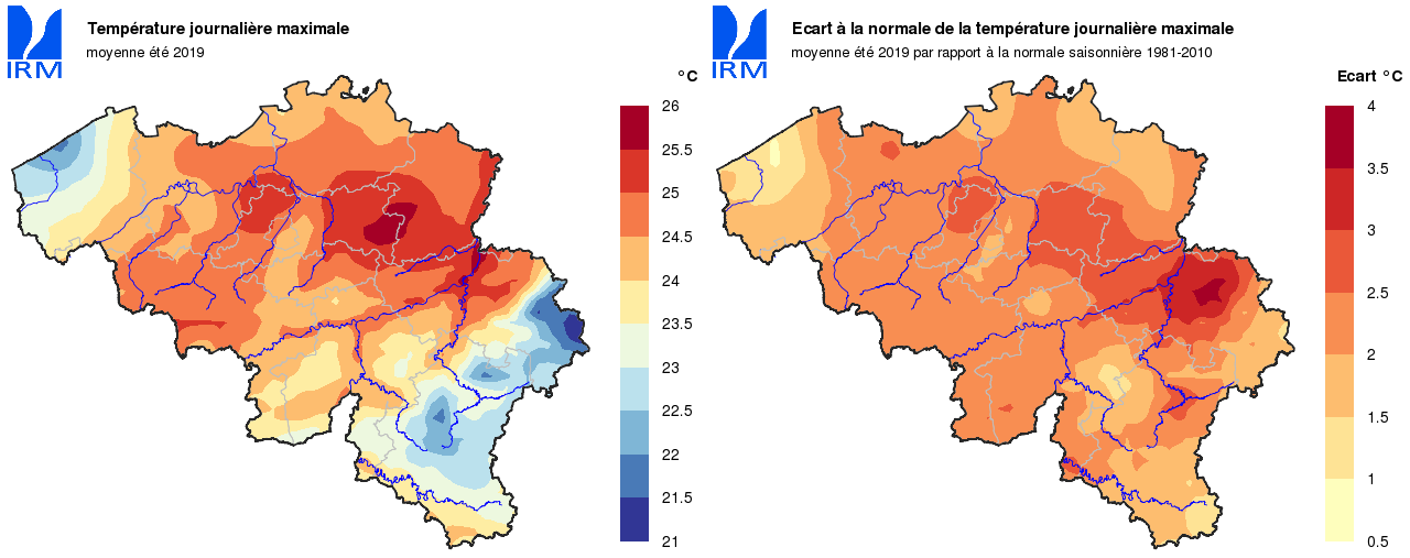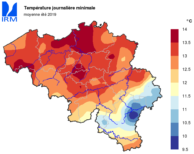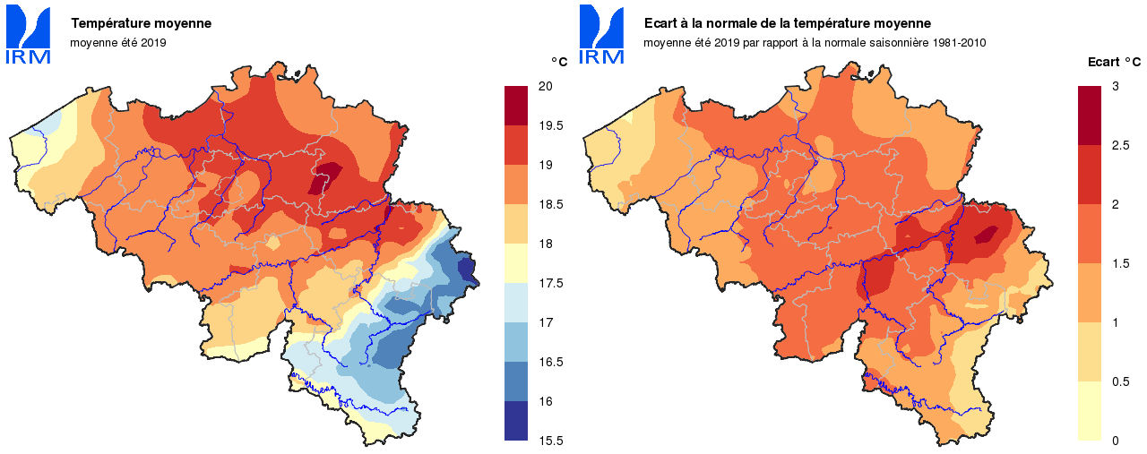 Principalement en raison de ces vagues de chaleur, la température moyenne de chacun des mois de l’été a été supérieure à la valeur normale. En conséquence, globalement, l’été est également plus chaud que la normale : la température moyenne estivale a atteint 19,1°C à Uccle, pour une valeur normale de 17,6°C. L’été 2019 se classe en 3e position parmi les étés les plus chauds (le record date de 2018, avec 19,9°C).