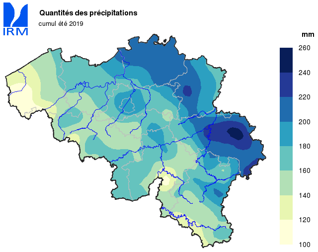 Les moyennes régionales des quantités de précipitations estivales dans le pays sont toutes inférieures aux normales, et parfois de manière importante. Elles se situent entre environ 60% des normales en Ardenne et environ 85% de la normale en Campine. Très localement, des averses orageuses abondantes ont pu donner lieu à des cumuls estivaux plus élevés.