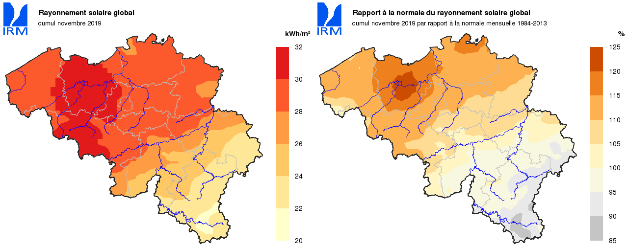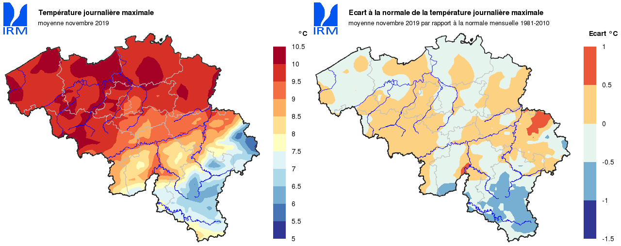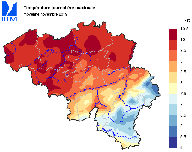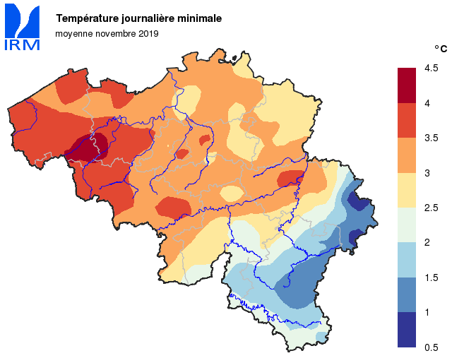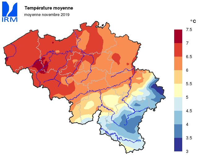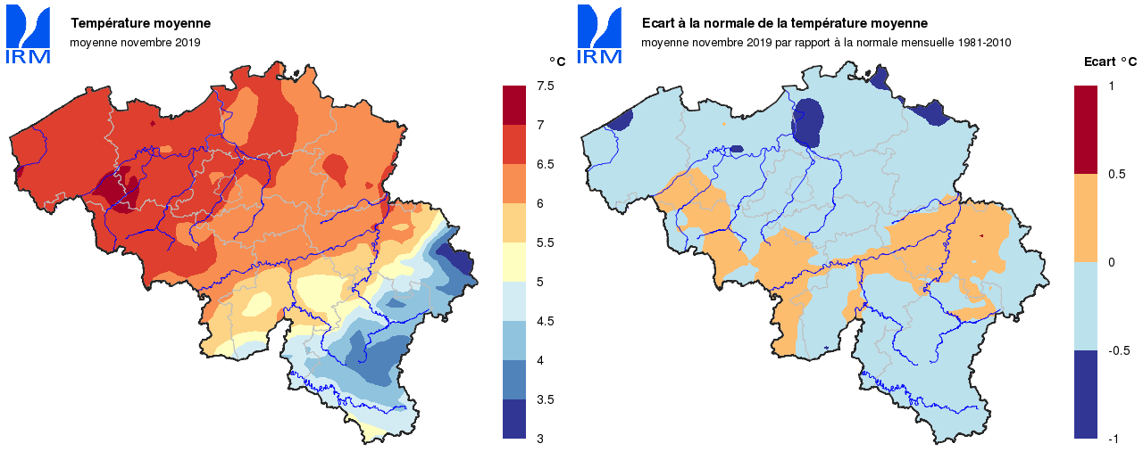 Novembre a débuté et s’est terminé (sauf le 30) plus chaudement qu’en moyenne à Uccle. Cependant, lors de la plus grande partie du mois (du 7 au 21 inclus), les températures se sont situées en dessous des valeurs normales. La température est devenue négative pour la première fois le 16. Finalement, la température moyenne mensuelle est juste inférieure à la valeur normale.
