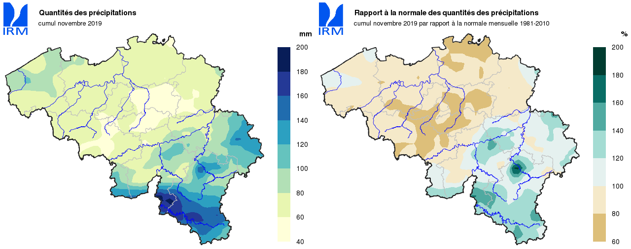 Les quantités régionales moyennes de précipitations mensuelles se situent autour des valeurs normales. Elles ont varié d’environ 80% de la normale au littoral et dans les Polders à environ 125% en Ardenne et en Lorraine belge. Toutes les valeurs sont normales.