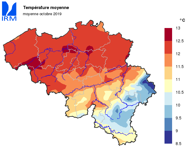 A Uccle, la température moyenne mensuelle fut de 12,0°C (normale : 11,1°C).