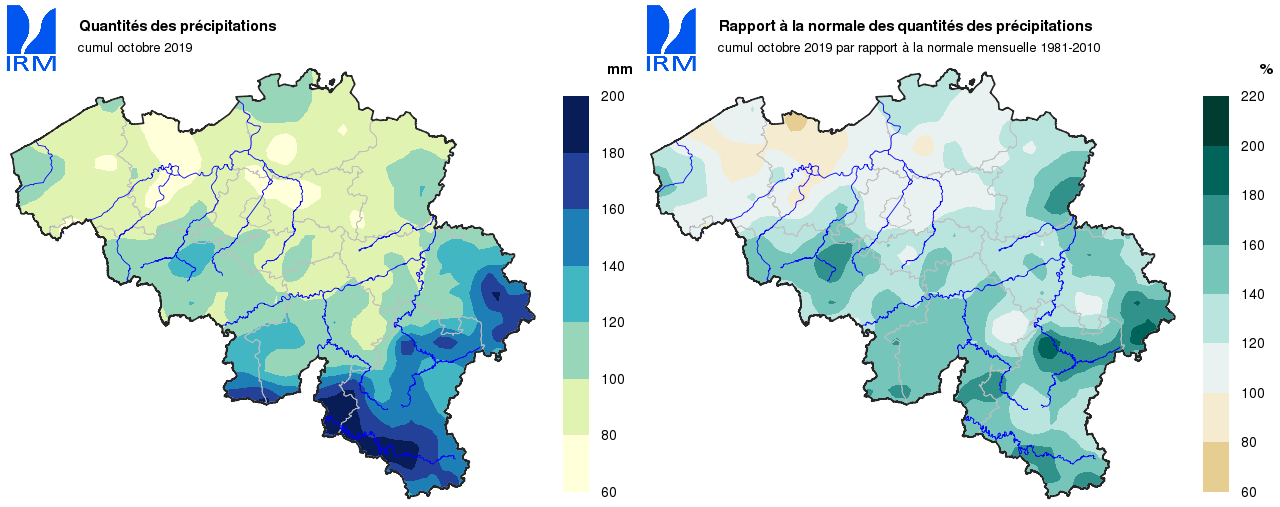 Les cumuls mensuels de précipitations en moyennes régionales furent presque tous supérieurs aux valeurs normales. Ils ont varié d’environ 95% de la normale au littoral à environ 145% des normales en Ardenne et en Lorraine belge.