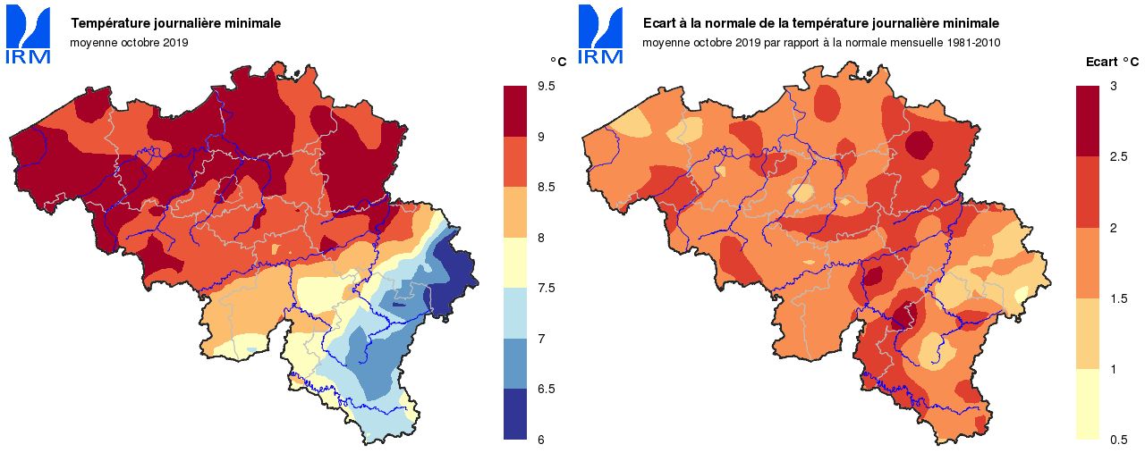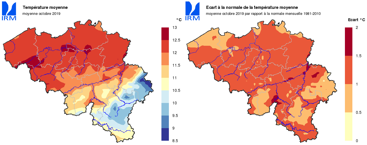 Octobre a débuté et s’est terminé avec des températures plus froides que les normales. Tout le reste du mois – du 10 au 26 inclus – les températures se sont situées au-delà des valeurs normales, et parfois de manière importante. Sur l’ensemble du mois, il en résulte des températures moyennes sensiblement plus élevées que les normales.