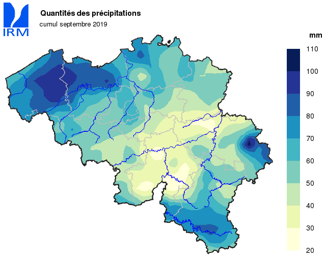 Il est tombé à Uccle un total de 62,6 mm de précipitations (norm.: 68,9 mm) en 15 jours (norm.: 15,7 jours). La plus grande partie des précipitations est tombée lors des derniers jours du mois : 50,7 mm à partir du 21. En 2004, il était tombé durant la 3e décade (21-30 septembre) juste un peu plus de précipitations que cette année : 51,0 mm. Avant cela, il faut remonter en 1974 pour trouver une dernière décade encore plus humide : 72,3 mm (c'est d'ailleurs le record depuis 1901).