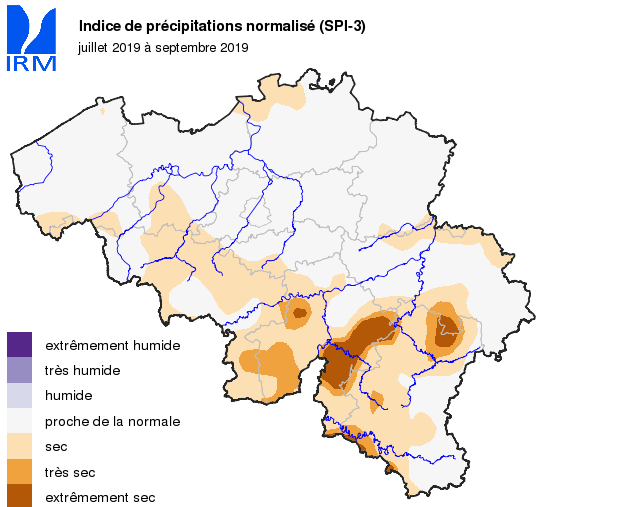 Les quantités de précipitations moyennes régionales dans le pays ont presque toutes été inférieures aux valeurs normales. Elles ont varié d’environ 45% de la normale dans le Pays de Herve à environ 105% dans les Flandres.