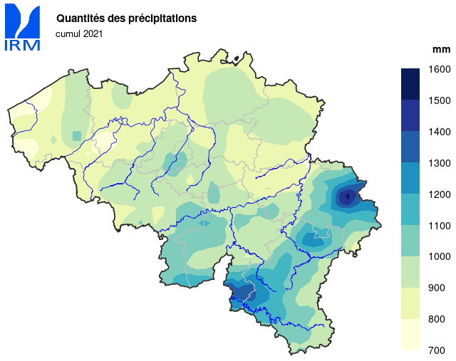 En Belgique, les cumuls totaux annuels de précipitations varient entre 773,5 mm à Laethem-Sainte-Marie (Zwalm) et 1574,1 mm au Mont-Rigi (Waimes).
