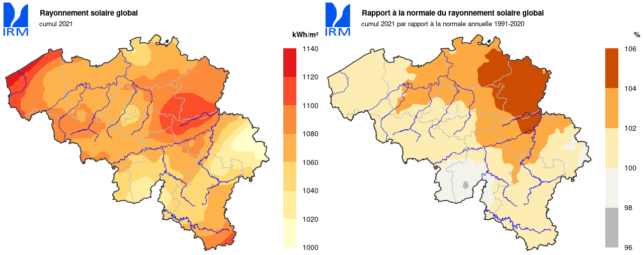 Le début de l’année 2021 a été très sombre. Pendant plusieurs jours, il a semblé qu'en janvier le record de 2018 (26h 59min) serait battu. Vers la fin du mois, quelques journées un peu plus ensoleillés ont suivi, avec un total de 27h 17min de soleil à Uccle. Après cela, les mois ensoleillés et sombres se sont alternés. Aucun record mensuel n'a été battu, et la durée totale d'insolation a finalement été très proche de la valeur normale : 1589h 57min, contre 1603h 40min (figure 8).