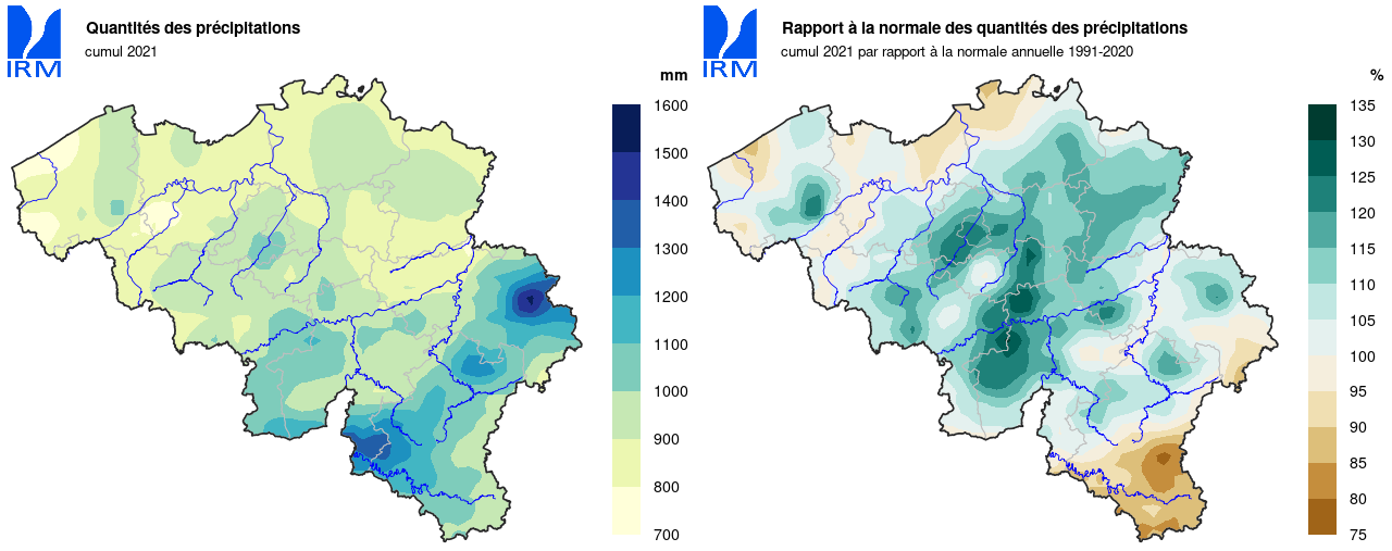Un total de 1038,8 mm de précipitations a été mesuré à Uccle (normale : 837,1 mm). Cette quantité est tombée en 192 jours (normale : 189,8 jours). L'année 2021 est ainsi la troisième année la plus humide de la période de référence actuelle, après 2001 (1088,5 mm) et 2002 (1077,8 mm). Si l'on considère l'ensemble des mesures depuis 1833, cette année 2021 s'est terminée à la septième place.