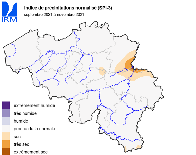 Les moyennes régionales des quantités de précipitations mensuelles dans le pays ont été partout inférieures aux normales. Elles ont varié d'environ 55% de la normale dans le Pays de Herve à environ 95% de la normale dans les Flandres.