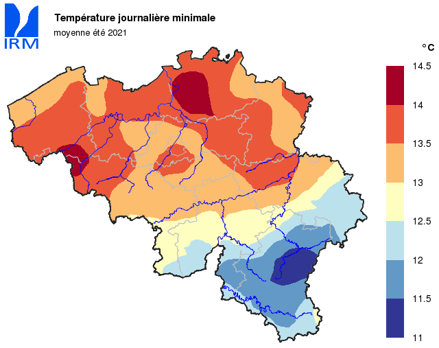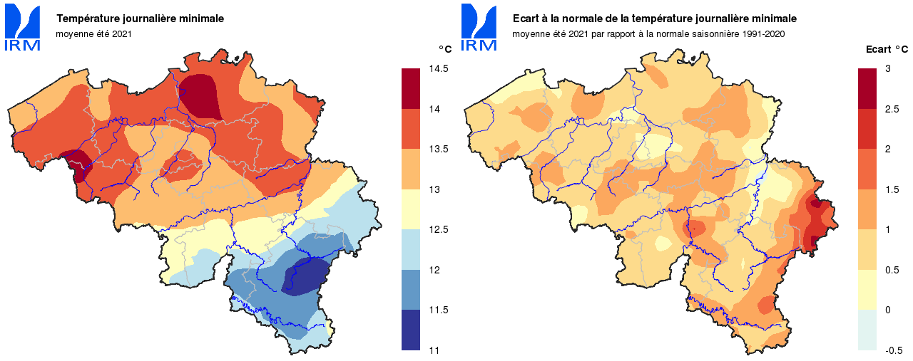 La température minimale moyenne a constitué une exception. En juin, un nouveau record absolu a été atteint. En juillet, cette valeur a représenté la seule température moyenne mensuelle supérieure à la normale. La température minimale moyenne du mois d’août est quant à elle restée proche de la normale. La température minimale moyenne de l’été à Uccle a atteint 13,9°C (normale : 13,4°C), ce qui lui vaut la quatrième place avec 2006 et 2019.