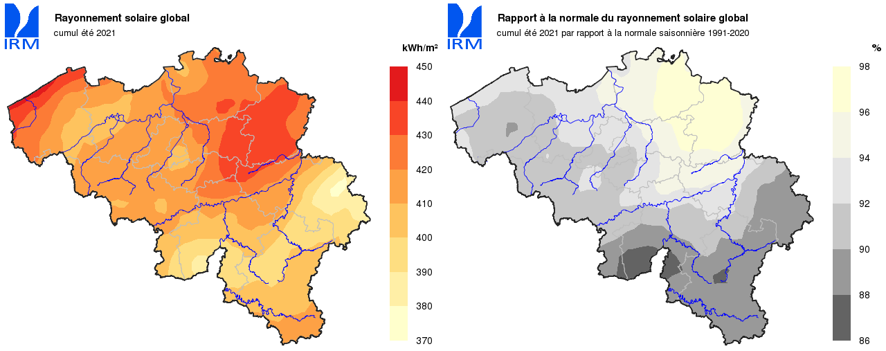 Notons aussi un nombre remarquable de jours avec un ciel très nuageux ou couvert : 36 jours enregistrés à Uccle (normale : 25,3 jours), égalant le record établi en 2002 et 2007 (sur base de mesures débutant en 1981).