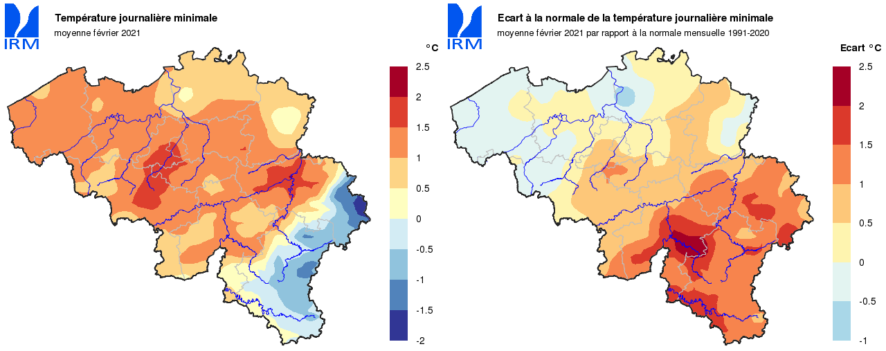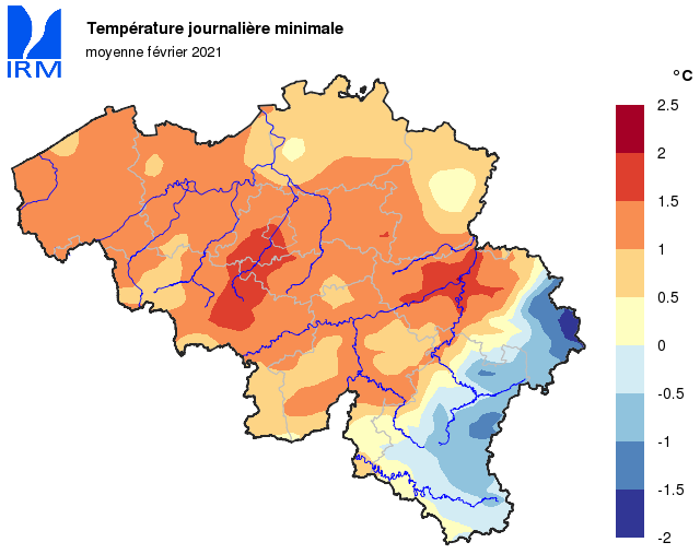 Dans le pays, la température la plus élevée fut mesurée le 24. A cette date, la température maximale dépassa 20°C en différents endroits, et principalement en Campine. Le maximum le plus élevé fut observé à Koersel (Beringen), avec 20,6°C. La température la plus basse atteignit -14,0°C et fut mesurée le 11 au Mont-Rigi (Waimes) et le 12 à Crupet (Assesse).