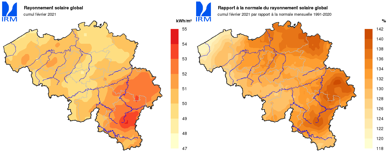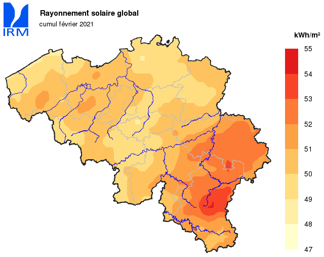 En début de mois, l’ensoleillement est resté faible. Mais, à partir du 9, le soleil fut généralement beaucoup plus présent, faisant finalement de février un mois très ensoleillé. A Uccle, la durée d’insolation mensuelle a atteint 121h 25min (normale : 72h 54min).