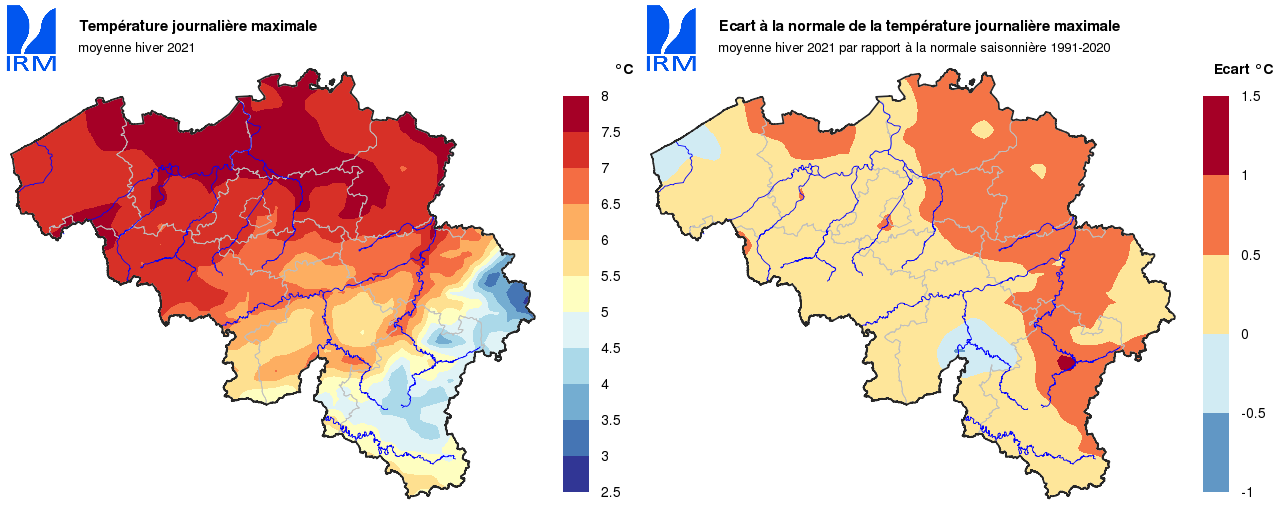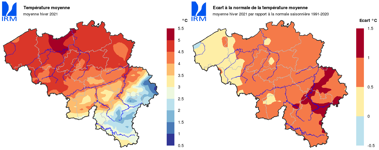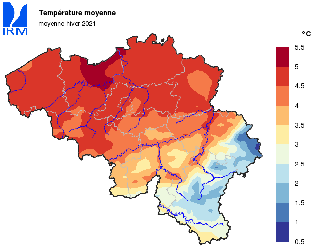 La succession de périodes plus froides et plus chaudes qu’en moyenne tout au long de l’hiver n’a pas conduit à des températures particulièrement anormales si l’on considère les moyennes mensuelles : à Uccle, décembre et février furent un peu plus chauds qu’en moyenne et janvier un peu plus froid. L’hiver dans son ensemble fut finalement plus chaud qu’en moyenne, avec 4,7°C (normale : 4,1°C).