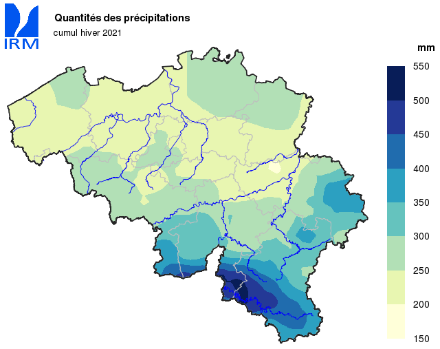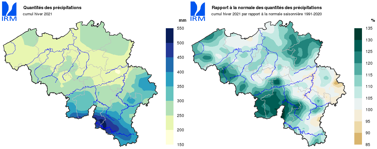 Les quantités régionales moyennes de précipitations dans le pays ont toutes été supérieures aux valeurs normales. Elles ont varié entre environ 100% de la normale dans la région Gileppe et Warche et environ 125% de la normale dans l’Entre-Sambre-et-Meuse.
