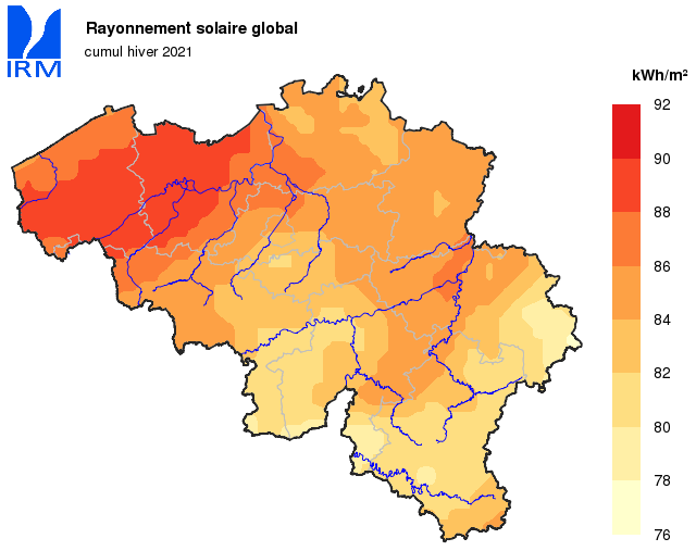 Décembre fut un mois sombre et janvier encore davantage puisqu’il fut le deuxième mois de janvier le plus sombre pour la période de référence actuelle. Le soleil a davantage brillé durant le court mois de février qu’au cours des deux autres mois hivernaux cumulés. Finalement, l’ensoleillement hivernal fut très proche de la moyenne : la durée d’insolation à Uccle a atteint 182h 22min (normale : 180h 17min).